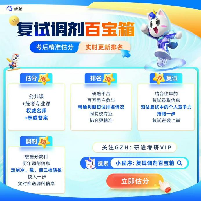 此外,为缓解学生在考后阶段普遍存在的信息焦虑与决策压力,研途依托其长期积累的百万级用户数据与院校专业信息库,于考后及时上线“复试调剂百宝箱”智能服务小程序。该系统不仅提供公共课与部分统考专业课的在线估分功能,更能结合历史录取数据与动态学情分析,为考生生成个性化的竞争力评估报告,辅助其明晰定位、科学决策。值得一提的是,该系统还能基于考生分数与往年调剂趋势,提供多层次、可参考的调剂信息,助力学子准确把握机会,稳妥规划未来发展。